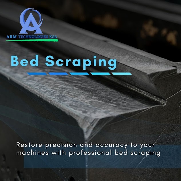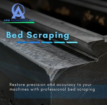 Bed scraping is a manual technique in which a we provide a technician uses a special tool called a scraper to remove small amounts of metal from the machine bed or slideways. This process helps to create a perfectly flat, smooth surface, often with a distinctive crosshatch pattern that improves oil retention and reduces friction. The goal is to restore the geometry and accuracy of the contact surfaces, ensuring proper alignment, movement, and support for moving parts. Bed scraping is commonly performed during machine overhauls or refurbishments and is considered a highly skilled craft in precision engineering.